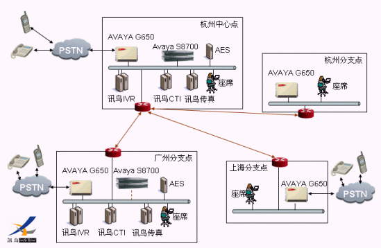 S8710、一套訊鳥(niǎo)CTI/IVR/傳真集中控制,其他各點(diǎn)通過(guò)G650接入。其中廣州分支點(diǎn)由于座席數(shù)較多,單獨(dú)部署一臺(tái)AES服務(wù)器、一套訊鳥(niǎo)CTI/IVR/傳真服務(wù)器。廣州點(diǎn)的一套AVAYA