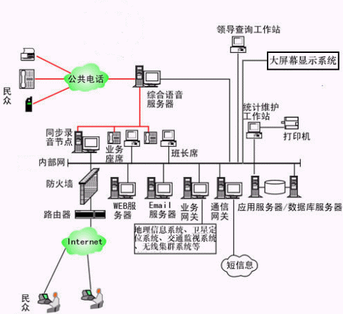 本系統(tǒng)物理結構由語音交換機、座席分流器、呼叫管理服務器(CTI服務器)、IVR(交互式語音應答)/IFR(交互式傳真應答、業(yè)務代表座席、調度席、統(tǒng)計維護管理工作站、數(shù)據(jù)庫/應用服務器、通信網關服務器、業(yè)務網關服務器、錄音工作站、領導查詢工作站、大屏幕顯示系統(tǒng)、網絡系統(tǒng)等構成。