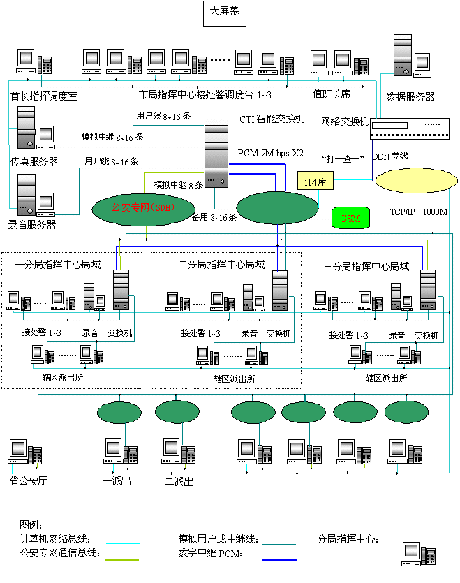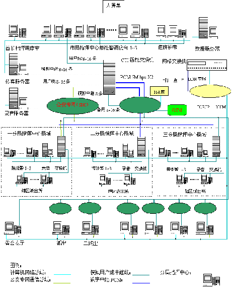 - 樹(shù)立大網(wǎng)絡(luò)概念:采用先進(jìn)的通訊、計(jì)算機(jī)網(wǎng)絡(luò)技術(shù)(采用CTI可編程交換技術(shù)),利用現(xiàn)有的通信資源,實(shí)現(xiàn)市局指揮中心與消防大隊(duì)、交警大隊(duì)、各派出所的計(jì)算機(jī)網(wǎng)絡(luò)及相關(guān)領(lǐng)導(dǎo)辦公室計(jì)算機(jī)大聯(lián)網(wǎng);形成全市范圍內(nèi)110、119、122有線、無(wú)線全方位立體調(diào)度語(yǔ)音通道大網(wǎng)。