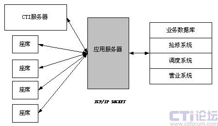 Ο數(shù)據(jù)接口采用三層C/S結(jié)構(gòu),通過構(gòu)建功能強(qiáng)大的應(yīng)用服務(wù)器,把呼叫中心的數(shù)據(jù)流與燃?xì)夤究蛻粝到y(tǒng)、營業(yè)系統(tǒng)、搶修系統(tǒng)和燃?xì)庹{(diào)度系統(tǒng)結(jié)合起來,充分利用了已有系統(tǒng)標(biāo)準(zhǔn)的數(shù)據(jù)接口,實(shí)現(xiàn)對后臺數(shù)據(jù)庫的訪問。如圖: