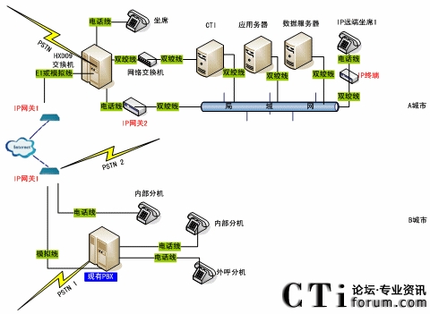 根據(jù)上述需求,我公司提出了電信PSTN網(wǎng)與IP網(wǎng)結(jié)合的IP語(yǔ)音解決方案,單位內(nèi)部呼叫采用IP網(wǎng)絡(luò),而對(duì)外呼出采用電信PSTN網(wǎng)絡(luò)。這套方案兩個(gè)主要原則:第一,最佳化地利用現(xiàn)有網(wǎng)絡(luò)資源,最大化地節(jié)省通話(huà)費(fèi)用;第二與現(xiàn)有電信電話(huà)交換網(wǎng)絡(luò)實(shí)現(xiàn)無(wú)縫連接,即電信PSTN呼入后,可以任意的轉(zhuǎn)接到本地分機(jī)或IP分機(jī),實(shí)現(xiàn)PSTN與IP網(wǎng)的平滑聯(lián)結(jié)。因此部署實(shí)施這個(gè)方案中,關(guān)鍵是內(nèi)部IP網(wǎng)絡(luò)保持暢通,以滿(mǎn)足高質(zhì)量的IP話(huà)務(wù)。