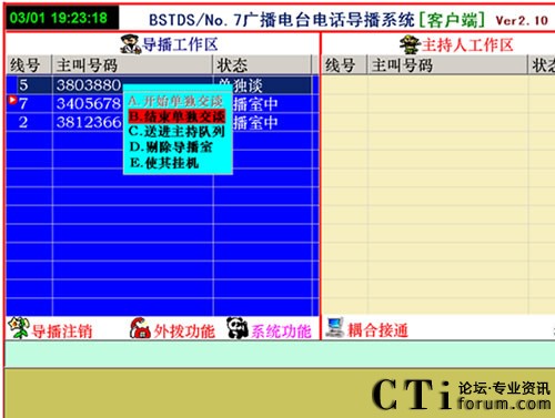 在上圖中,其中信號表示第5路、第7路、第2路分別來了3個電話,其電話號碼顯示在上面。其狀態(tài)都是在導(dǎo)播室中。這時導(dǎo)播想接通某路電話就在某路電話的上面點擊鼠標右鍵會出現(xiàn)如下彈出示菜單: