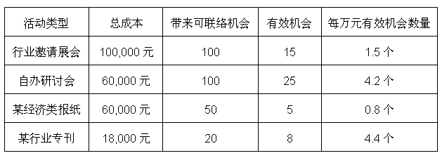 從前面的分析中,我們曾經(jīng)談到過:市場的核心是用最低的成本,幫助企業(yè)把目標(biāo)客戶推動(dòng)成為機(jī)會客戶。那么,同樣成本推動(dòng)為有效機(jī)會客戶數(shù)量的多少,則是評價(jià)市場方案的有效模型。當(dāng)然,針對個(gè)人消費(fèi)市場,似乎可以用更加簡單的投入產(chǎn)出比進(jìn)行分析,一種類型的市場投放運(yùn)作,在一定時(shí)間內(nèi)帶來的業(yè)績收益與成本的比較,可以方便地了解到不同類型市場投放的效益對比;而對于大部分需要有銷售過程的機(jī)構(gòu)消費(fèi)客戶,我們可以參考以下我們對劉總公司拿出的模型示例: