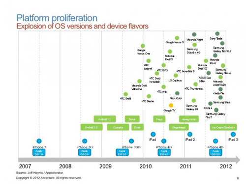 蘋(píng)果的iPhone開(kāi)啟了智能手機(jī)的革命,并且很快獲得了消費(fèi)者的青睞,但是Android平臺(tái)正以一個(gè)更快的速度蔓延世界。在上個(gè)月的世界移動(dòng)大會(huì)上,Accenture的分析師 Lars Kamp分享了一份非常有參考價(jià)值的研究報(bào)告,揭示了移動(dòng)世界的未來(lái)趨勢(shì)。我們從中摘取了9幅數(shù)據(jù)圖供您參考: