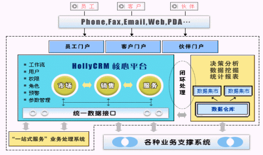 更關(guān)鍵是,HOLLYCRM(合力金橋軟件)的CRM不是單純的、簡單的客戶管理產(chǎn)品,它是一套完整的解決方案,覆蓋了協(xié)作型、運(yùn)營型和分析型的全部范疇,其結(jié)構(gòu)框架見圖,其核心平臺(tái)涉及到市場、銷售、服務(wù)等多個(gè)環(huán)節(jié),并通過數(shù)據(jù)集市或者數(shù)據(jù)倉庫的形式,提供數(shù)據(jù)挖掘、決策分析等服務(wù)。最關(guān)鍵的是,HOLLYCRM(合力金橋軟件)在提供解決方案外,還不斷提升管理和咨詢能力,和一些咨詢公司合作,將咨詢和產(chǎn)品作為一個(gè)整合的方案提供給用戶,并提供360度的系統(tǒng)咨詢、設(shè)計(jì)和實(shí)施、維護(hù)服務(wù)。
