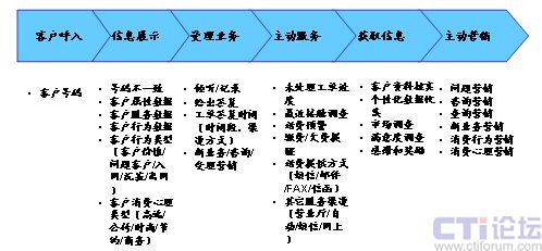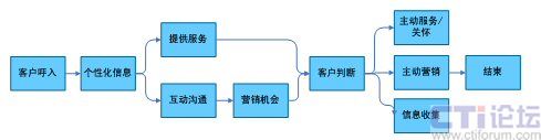 在上面的流程中,將一次客戶接觸,轉(zhuǎn)變?yōu)橐淮稳娴目蛻艋?dòng)機(jī)會(huì),通過對(duì)客戶信息360度的洞察和客戶的互動(dòng)溝通,在為客戶提供基本服務(wù)的同時(shí),根據(jù)客戶的基本資料、歷史消費(fèi)數(shù)據(jù)等,挖掘客戶的隱性需求,從而有選擇的開展客戶關(guān)懷、客戶信息收集、客戶維系、主動(dòng)營(yíng)銷活動(dòng)。下面以一個(gè)電信運(yùn)營(yíng)商的客戶呼入流程為例,說明在一個(gè)以客戶為中心的客戶接觸流程中,坐席代表可以開展的客戶接觸活動(dòng)(圖4)。