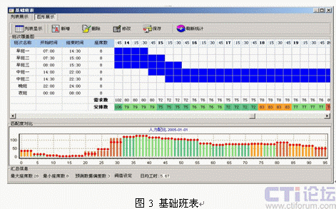引入呼叫中心排班系統(tǒng)是提升坐席資源利用率的有效解決方案,排班系統(tǒng)可以對(duì)大量的歷史呼叫數(shù)據(jù)進(jìn)行分析,并剔除特殊事件對(duì)呼叫量的影響,從而得出呼叫量變化的規(guī)律曲線(xiàn),再輔助對(duì)特殊預(yù)期事件影響度的疊加,可以對(duì)未來(lái)一定時(shí)間的呼叫量變化做出比較客觀(guān)的預(yù)測(cè)(圖2)。在預(yù)測(cè)話(huà)務(wù)量變化曲線(xiàn)的同時(shí),結(jié)合人員技能和班次設(shè)定,給出高擬合度的人工排班方案(圖3)。更為重要的是,成熟排班系統(tǒng)提供的話(huà)務(wù)預(yù)測(cè)模型多具備學(xué)習(xí)能力,能夠?qū)㈩A(yù)測(cè)的話(huà)務(wù)數(shù)據(jù)與實(shí)際話(huà)務(wù)數(shù)據(jù)進(jìn)行對(duì)比,從而不斷提高話(huà)務(wù)預(yù)測(cè)模型的預(yù)測(cè)精度。成熟排班工具可以在保持呼叫中心同等服務(wù)水平的前提下,降低人工坐席代表的投入數(shù)量,進(jìn)而釋放部分人工資源開(kāi)展其它業(yè)務(wù)。