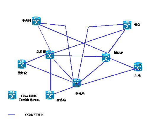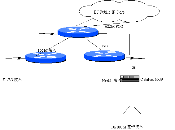 北京電信公眾IP網(wǎng)中,骨干網(wǎng)核心節(jié)點(diǎn)路由器為業(yè)界最 先進(jìn)的新一代電信級(jí)高性能的路由交換機(jī) Cisco GSR 12016太比特系統(tǒng); 邊緣節(jié)點(diǎn)路由器為GSR 12008,Cisco 7513;10/100M局域網(wǎng)接入設(shè)備為Catalyst 6509交換機(jī)。