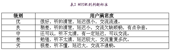 MOS(MeanOpinionScore)是一種常用的主觀評價(jià)標(biāo)準(zhǔn)。IP電話業(yè)務(wù)的MOS定義為四級(jí):4.0-5.0(優(yōu))、3.5-4.0(良)、3.0-3.5(中)、1.5-3.0(差)、0-1.5(劣)。用戶滿意度和MOS等級(jí)的對應(yīng)關(guān)系見表2。