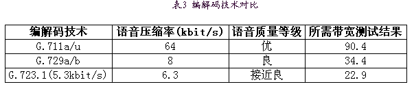 為進(jìn)一步節(jié)省帶寬,又采用語音激活檢測技術(shù)(VAD)及舒適噪音生成(CNG)技術(shù),VAD技術(shù)只有當(dāng)檢測到語音處于活動(dòng)狀態(tài)時(shí),編碼器的輸出信號(hào)才被送到網(wǎng)絡(luò)上,因此節(jié)省了帶寬。而在靜音時(shí)段采用CNG技術(shù),生成與背景噪聲相匹配的較舒適的靜音,避免了用戶有不自然的交談感覺,保證通話質(zhì)量。實(shí)際測試結(jié)果如表4,采用G.72920ms打包+VAD技術(shù)節(jié)省了近75%的帶寬。
