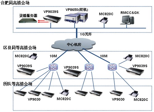 為滿足安徽省煙草合肥市公司日常工作會(huì)議、集中培訓(xùn)、遠(yuǎn)程匯報(bào)等工作業(yè)務(wù)需求,同時(shí)為應(yīng)對突發(fā)事件提供可靠可行的交互平臺(tái),實(shí)現(xiàn)多地點(diǎn)、遠(yuǎn)距離的視頻、音頻和數(shù)據(jù)的互通交流。深圳市金華威數(shù)碼科技有限公司工程師建議新建的視訊系統(tǒng)采用高清的視頻會(huì)議組網(wǎng)模式,其中市局、三縣與區(qū)局、所隊(duì)及營銷部所有會(huì)場節(jié)點(diǎn)建設(shè)高清視頻會(huì)議系統(tǒng)。