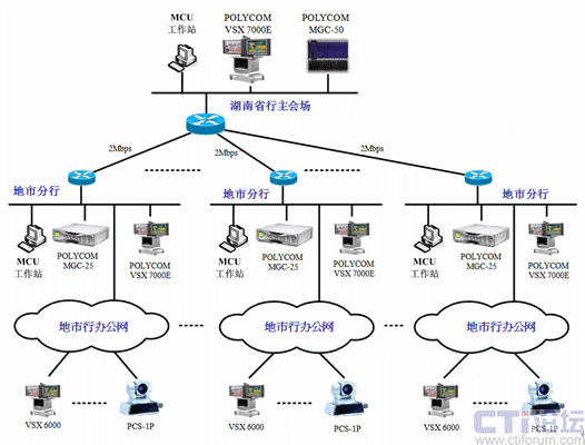 在株洲、邵陽和永州市行采用級聯(lián)的方式來實(shí)現(xiàn)。具體實(shí)現(xiàn)方式為:VSX 7000E則和地市行的MGC-25通訊,并且MGC-25負(fù)責(zé)其縣支行終端的接入,同時用MGC-50和MGC-25的端口級聯(lián),采用這種連接方式就可以實(shí)現(xiàn)從省行-地市行-縣支行的三級網(wǎng)視頻會議的召開。
