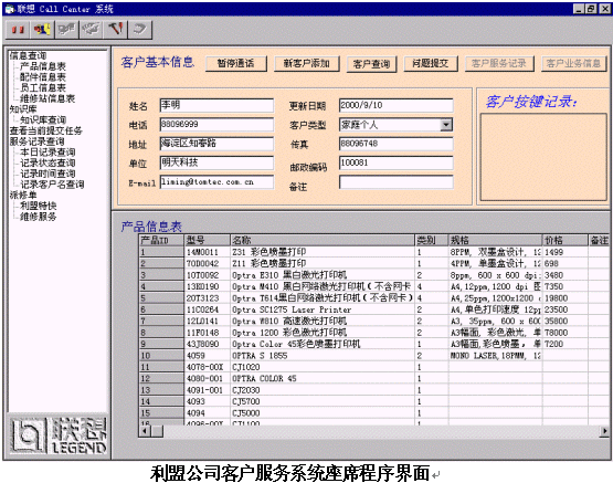聯(lián)想神州數(shù)碼電子商務部于2000年7月承建利盟中國公司客戶服務中心系統(tǒng),該客戶服務系統(tǒng)可以為利盟全國的用戶提供產品、信息、價格、咨詢等服務;服務方式包括人工、語音、傳真、郵件等。
