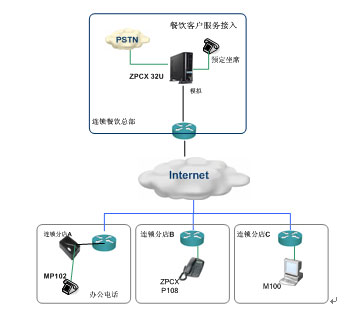 在總部選用ZPCX32U作為系統(tǒng)核心平臺,提供中繼接入和總部辦公電話分機(jī),內(nèi)置IVR等擴(kuò)展功能,作為該企業(yè)統(tǒng)一接入門戶和組網(wǎng)核心平臺。