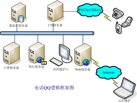 電話QQ系統(tǒng)主要由CTI服務(wù)器、數(shù)據(jù)庫服務(wù)器、計費(fèi)服務(wù)器、短信服務(wù)器、管理維護(hù)臺和Web服務(wù)器組成。
