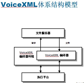 VoiceXML設(shè)計(jì)的工作原理:語(yǔ)音應(yīng)用程序作為系列頁(yè)存儲(chǔ)在類似于網(wǎng)絡(luò)服務(wù)器的文件服務(wù)器上。從實(shí)現(xiàn)平臺(tái)接收到輸入呼叫時(shí),VoiceXML編譯程序會(huì)向文件服務(wù)器發(fā)出一個(gè)特定URL請(qǐng)求,就像用戶瀏覽網(wǎng)絡(luò)時(shí)輸入網(wǎng)站地址一樣。文件服務(wù)器可以與編譯程序直接相連,也可以設(shè)置在外部,通過(guò)本地網(wǎng)或互聯(lián)網(wǎng)的IP協(xié)議訪問(wèn)。他們可以保持應(yīng)用程序的服務(wù)邏輯,可以提供數(shù)據(jù)庫(kù)查找與其他系統(tǒng)操作功能。