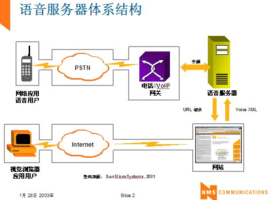 世界上最古老的用戶界面--人類語(yǔ)言終于在二十一世紀(jì)借助于VoiceXML,一種語(yǔ)音可擴(kuò)展標(biāo)記語(yǔ)言發(fā)展成熟起來(lái)。作為世界上第一個(gè)真正的語(yǔ)音通信標(biāo)準(zhǔn),它定義了應(yīng)用開(kāi)發(fā)商向用戶提供新型信息訪問(wèn)服務(wù)的方式。通過(guò)這種服務(wù),用戶在任何地方,都可以通過(guò)電話或任何移動(dòng)設(shè)備,虛擬訪問(wèn)任何信息。VoiceXML正在被廣泛應(yīng)用于旅游、金融與信息服務(wù)等行業(yè)的各種業(yè)務(wù)領(lǐng)域中,甚至是政府部門與市政機(jī)構(gòu),全球的無(wú)線運(yùn)營(yíng)商等。