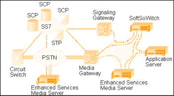在PSTN網(wǎng),交換機(jī)組、SCP(Service Connection Points)和媒體服務(wù)器協(xié)同工作,為用戶提供服務(wù)。在包交換網(wǎng)絡(luò)環(huán)境,這種服務(wù)由軟件交換機(jī)(Softswiches)、媒體服務(wù)器和應(yīng)用服務(wù)器協(xié)同提供。連接這兩種網(wǎng)絡(luò)的橋梁是媒體網(wǎng)關(guān)和信令網(wǎng)關(guān)。值得注意的是,包交換中的部件都是邏輯點(diǎn),其多個(gè)部件可能僅僅由網(wǎng)絡(luò)中的一個(gè)應(yīng)用硬件平臺(tái)提供。例如:一個(gè)基于網(wǎng)絡(luò)提供語音識別功能的語音郵件系統(tǒng)可能包括如下模塊: