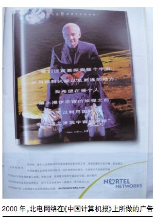 2000年,北電網(wǎng)絡(luò)在《中國計算機(jī)報》上所做的廣告 1995年,北電開始從電話制造公司向網(wǎng)絡(luò)設(shè)計、構(gòu)建及集成公司的演變。起初,業(yè)界分析人士對此予以奚落,認(rèn)為這是一家電信商膚淺的裝飾門面之舉。一位分析師曾尖銳地稱之為“一群四十多歲的人穿著跳迪斯科的衣服”。