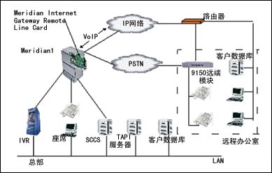采用北電網(wǎng)絡(luò)的RemoteOffice解決方案。對于主叫用戶,與原來的撥號方案完全一樣;對于話務(wù)員座席,只是將交換機的數(shù)字座席通過廣域網(wǎng)或者專線方式連到遠端。該方案在呼叫中心的PBX上安裝北電的Meridian
