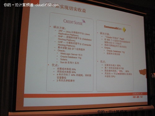 還有一個(gè)客戶是澳大利亞聯(lián)邦銀行(Commonwealth Bank)。該公司選用Oracle Database 11g和Oracle數(shù)據(jù)庫(kù)云服務(wù)器,開發(fā)了一個(gè)名為“Oracle即服務(wù)”的PaaS,將300個(gè)中小型數(shù)據(jù)庫(kù)環(huán)境整合到3個(gè)網(wǎng)格中。目前該銀行運(yùn)營(yíng)成本減少50%,根據(jù)需要就可從資源池中獲取CPU,實(shí)現(xiàn)了靈活性, 在第1年即實(shí)現(xiàn)盈虧平衡。