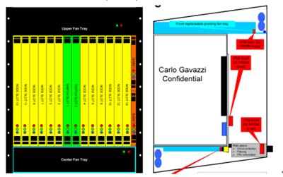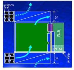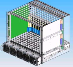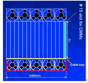 另外在機架內的放置空間上,42U的標準機架里可以放3臺12~14U機箱,若將機箱降至10U則可以放置4臺,這樣可以增加整體空間的利用率,所以有了10U機箱的設計需求。在各種不同高度的機箱設計中,風扇散熱系統(tǒng)的放置位置、方式與總散熱效能能夠達到200*14=2800W,將會是ATCA機箱設計所要考慮的最重要因素之一,尤其是在10U的機箱設計上。