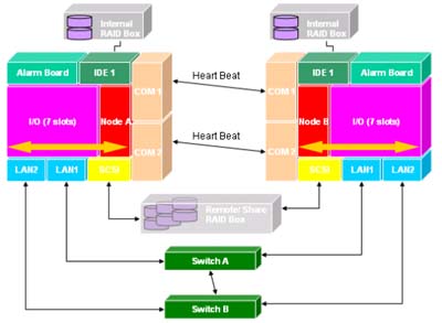 在網(wǎng)絡方面,上圖的兩臺CompactPCI系統(tǒng)各有兩個LAN,分別可透過Switch經(jīng)由防火墻連接到外部網(wǎng)絡。兩個Switch之間有網(wǎng)絡連通,且每個系統(tǒng)至少有兩個LAN可維持系統(tǒng)的網(wǎng)絡通暢。