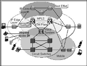 不同的網(wǎng)將按各自的極佳方向獨立演進,融合發(fā)展。最終形成一個統(tǒng)一的融合的主要是以IP為基礎(chǔ)的分組化網(wǎng)。如圖1所示。然而,從傳統(tǒng)的電路交換網(wǎng)到分組化網(wǎng)將是一個長期的漸進過渡過程,因而在今后20年甚至更長的時間兩種網(wǎng)絡(luò)將共存。