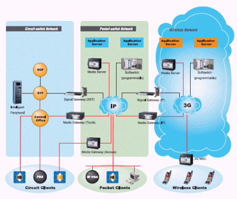 、隨選視訊(Video Streaming) 等應用,著重在聲音影像,深具高度收益的潛力,而被服務供貨商大力推廣。但是服務提供業(yè)者為了讓使用者能輕易的在現(xiàn)行設備上溝通聲音影像,必須肩負極高的成本,同時運營兩種網(wǎng)絡。因此在不損壞傳統(tǒng)語音網(wǎng)絡穩(wěn)定運作而又能快速建置整合新一代IP通訊建設的限制下,『寬頻通訊平臺』便以網(wǎng)關(Gateway)的形式出現(xiàn)扮演接口角色,成為網(wǎng)絡設備供貨商及電信系統(tǒng)業(yè)者最佳的解決方案。不但同時支持IP網(wǎng)絡又負起和傳統(tǒng)網(wǎng)絡以SS7為主的PSTN(Public