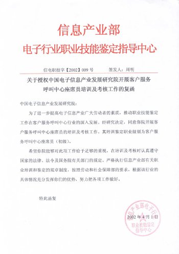 中國電子信息產(chǎn)業(yè)發(fā)展研究院職業(yè)技能培訓(xùn)部是中國電子信息產(chǎn)業(yè)發(fā)展研究院旗下專業(yè)從事IT職業(yè)技能培訓(xùn)的機構(gòu)。呼叫中心職業(yè)技能培訓(xùn)工作是培訓(xùn)中心常年開展的主要培訓(xùn)項目。培訓(xùn)中心受信息產(chǎn)業(yè)部委托,負(fù)責(zé)全國范圍內(nèi)"呼叫中心客戶服務(wù)座席員"的授權(quán)培訓(xùn)及考核工作。既是呼叫中心行業(yè)基礎(chǔ)操作人員培訓(xùn)及考核的權(quán)威機構(gòu),又是配合行業(yè)管理、全面支撐和提升整個呼叫中心產(chǎn)業(yè)的服務(wù)機構(gòu)。