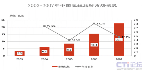 根據(jù)Iresearch的數(shù)據(jù),2007年,中國在線旅游市場規(guī)模達(dá)到22.7億元,比06年同比增長47.5%;其中攜程以56.3%的市場份額繼續(xù)領(lǐng)跑,比06年的54.2%增長了2個百分點。與此相對比的是,美國三強旅游網(wǎng)站之一的Travelocity,在06年第一季度的全球營收就達(dá)到了24億美金。具體情況如下圖所示:
