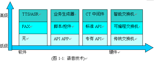 語言產(chǎn)品線可以用如下(圖1-1)一條技術(shù)柱心表示, 在每一個技術(shù)層面上, 國內(nèi)通信企業(yè)都有相應(yīng)的產(chǎn)品, 不同技術(shù)層面技術(shù)組合,成為一系列列產(chǎn)品解決方案.