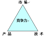 企業(yè)要發(fā)展, 關(guān)鍵于企業(yè)的核心競(jìng)爭力, 企業(yè)如何具有核心競(jìng)爭力, 特別是通信企業(yè), 我認(rèn)為, 通信企業(yè)要具有核心競(jìng)爭力, 決定于三個(gè)因素: 市場(chǎng), 產(chǎn)品, 技術(shù). 這三個(gè)因素構(gòu)筑企業(yè)強(qiáng)大競(jìng)爭力---競(jìng)爭力三角型. 三角型的邊則是產(chǎn)品經(jīng)理的活動(dòng)軌道. 圖1-1