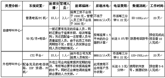 以上是以Telemarkering項目舉例,如需完成一萬條數(shù)據(jù)的外呼工作,自建呼叫中心與外包型呼叫中心的區(qū)別。以上數(shù)字只是提現(xiàn)在設(shè)備、人員效率等方面問題,另定期的人員培訓及相關(guān)系統(tǒng)的維護將是費用產(chǎn)生的一大因素。其實在項目的實施過程中發(fā)生的費用只是一部分,從公司的運營角度看是可以節(jié)省很大的精力(例如:人員招聘、培訓、福利待遇)及運營時間。