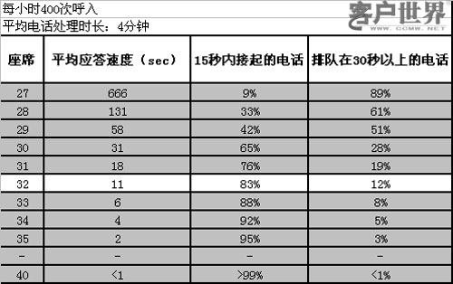 然而,圖3從客戶感受的角度來分析問題。從客戶的角度來看,客戶聯(lián)絡(luò)中心提供的服務(wù)并沒有達(dá)到他們期望。對于每個(gè)來電者最首要的問題是要求在幾秒鐘內(nèi)接通電話。如果所有的座席都忙碌,這種可能性就會(huì)大大降低了。如果在線座席代表數(shù)量不足,則平均排隊(duì)時(shí)間就會(huì)增加,這將導(dǎo)致客戶的不滿,進(jìn)而將他們的業(yè)務(wù)轉(zhuǎn)向別處。