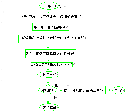 話務(wù)員不需要說(shuō)話, 系統(tǒng)在所有必要之處都有提示音, 話務(wù)員只要在數(shù)字鍵盤(pán)上鍵入部門(mén)號(hào)"0××"和電話號(hào)碼"2××"。