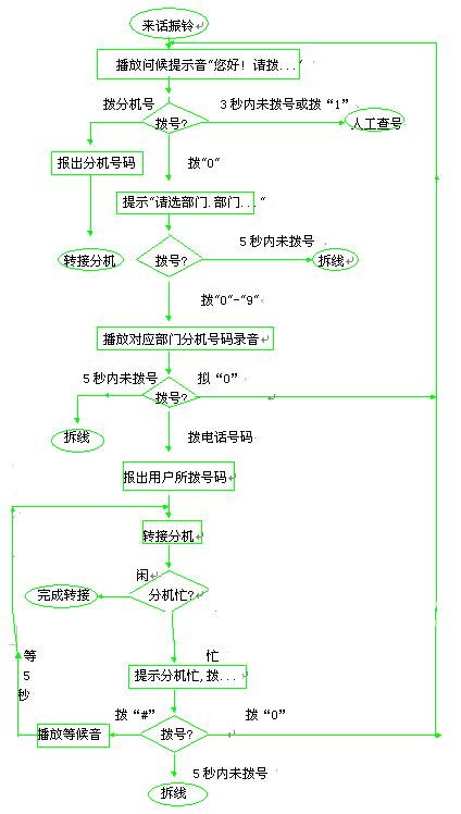 來(lái)話首先被接至自動(dòng)查號(hào)接續(xù)系統(tǒng), 自動(dòng)系統(tǒng)的工作流程如下: