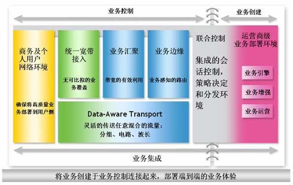 首先,我們提供了智能的、具備業(yè)務(wù)感知能力的、安全的融合網(wǎng)絡(luò):這意味著通過安全的網(wǎng)絡(luò)將正確的業(yè)務(wù)部署到正確的客戶端,并保證最高體驗質(zhì)量。它的本質(zhì)是在網(wǎng)絡(luò)的各個層面部署智能化和業(yè)務(wù)感知的元素,并實施完整的安全機制,正如我們前面提到的,業(yè)務(wù)演進與網(wǎng)絡(luò)間相互有著緊密關(guān)聯(lián),為達到業(yè)務(wù)需求,網(wǎng)絡(luò)需要能夠根據(jù)業(yè)務(wù)進行靈活調(diào)整。
