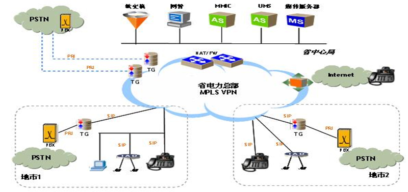 上海貝爾阿爾卡特的VoIP行業(yè)應(yīng)用解決方案可以幫助電力行業(yè)用戶(hù)提供可定制、可管理的VOIP增值業(yè)務(wù),包括IP Centrex、VPN、IP多媒體會(huì)議、Web 呼叫中心、一號(hào)通、Web800、統(tǒng)一消息、電子商務(wù)等多種業(yè)務(wù)。網(wǎng)絡(luò)拓?fù)鋱D如下: