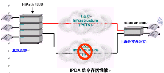 人們也許會(huì)問,IP語音(VoIP)是否足夠可靠?如果IP網(wǎng)絡(luò)上的信令通道出現(xiàn)故障,HiPath平臺(tái)仍將保證對各接入點(diǎn)的控制,從而提供了可靠的信令存活性能(Signaling Survivability)。在下面的圖例中,當(dāng)企業(yè)IP網(wǎng)絡(luò)出現(xiàn)某些問題后,信令通道轉(zhuǎn)移到了公共交換電話網(wǎng)絡(luò)(PSTN)之上。