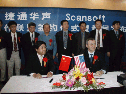 2004年5月20日,北京捷通華聲語(yǔ)音技術(shù)有限公司與美國(guó)Scansoft公司(Nasdaq:SSFT)宣布就語(yǔ)音技術(shù)全面合作達(dá)成戰(zhàn)略聯(lián)盟,雙方在北京正式簽署了合作協(xié)議,并舉行了新聞發(fā)布會(huì)。
