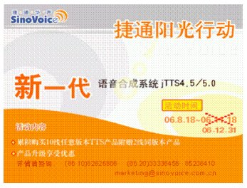 2006年8月18日,捷通華聲正式發(fā)布新一代語(yǔ)音合成系統(tǒng)jTTS4.5,同時(shí)啟動(dòng)了為期三個(gè)月的“陽(yáng)光行動(dòng)”。行動(dòng)一經(jīng)推出,立即引起了強(qiáng)烈的市場(chǎng)反響。每日致電(86-10)82826886咨詢jTTS4.5產(chǎn)品及價(jià)格詳情的客戶接連不斷,通過(guò)訪問(wèn)捷通華聲語(yǔ)音合成在線演示系統(tǒng)http://www.sinovoice.com.cn/2-e-1.asp或者撥打24小時(shí)產(chǎn)品演示熱線(86-10)82826886-8624體驗(yàn)合成效果自然度和流暢度的用戶絡(luò)繹不絕,定購(gòu)產(chǎn)品享受累積購(gòu)買10線任意版本TTS附贈(zèng)2線同版本產(chǎn)品等優(yōu)惠政策的合作伙伴更是紛至沓來(lái)。大家都對(duì)jTTS4.5的新增甜美音色大加贊賞,更對(duì)jTTS4.5合成效果自然度和流暢度的提升給予了極大的肯定及滿意,同時(shí)表達(dá)出希望能延長(zhǎng)活動(dòng)時(shí)間的誠(chéng)懇建議。為答謝新老客戶對(duì)捷通產(chǎn)品的關(guān)注與厚愛(ài),捷通公司特決定將“陽(yáng)光行動(dòng)”活動(dòng)時(shí)間延期至12月31日。