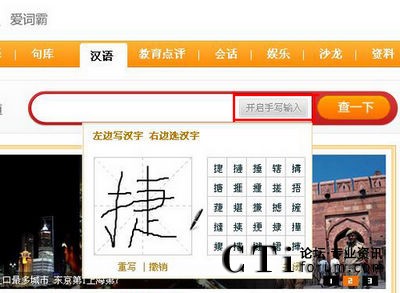 打開金山軟件公司的愛詞霸漢語網(wǎng)站,點(diǎn)擊 “開啟手寫輸入”選項(xiàng),進(jìn)入手寫輸入框界面,輸入框簡潔清爽,用戶可通過鼠標(biāo)取代鍵盤和手寫板,自由在搜索框中輸入關(guān)鍵字。