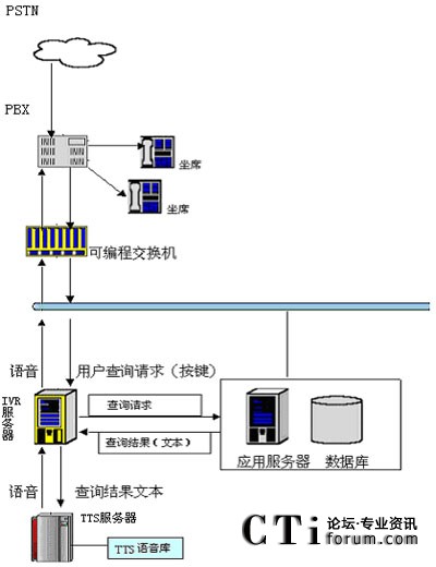 用戶撥打統(tǒng)一特服號(hào)碼進(jìn)入客戶服務(wù)系統(tǒng),經(jīng)過(guò)自動(dòng)語(yǔ)音系統(tǒng)提示,選擇公共信息查詢項(xiàng)目。用戶可以通過(guò)電話提交他的查詢請(qǐng)求(比如使用按鍵方式),IVR服務(wù)器收到請(qǐng)求后會(huì)向其他應(yīng)用服務(wù)器提交此查詢請(qǐng)求,當(dāng)IVR得到查詢結(jié)果后,他會(huì)將文本形式的查詢結(jié)果交給jTTS服務(wù)器,jTTS服務(wù)器會(huì)返回查詢結(jié)果的語(yǔ)音形式,最終語(yǔ)音會(huì)在坐席上播放,用戶就可以聽到他剛才所要查詢的信息。