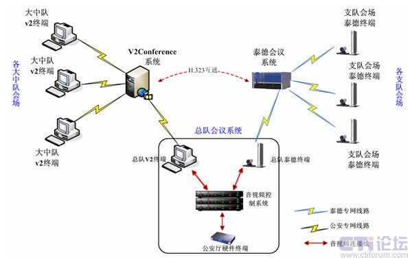 另外在廣東省消防信息系統(tǒng)內(nèi),現(xiàn)有硬件泰德電視電話(huà)會(huì)議系統(tǒng)共有23個(gè)終端節(jié)點(diǎn),主要基于獨(dú)立的IP專(zhuān)用網(wǎng)絡(luò),并與V2conference系統(tǒng)所在IP網(wǎng)絡(luò)相互獨(dú)立。為了達(dá)到和硬件系統(tǒng)共用互通,實(shí)現(xiàn)全網(wǎng)會(huì)議互通,在總隊(duì)會(huì)議系統(tǒng)中,將會(huì)議系統(tǒng)一級(jí)網(wǎng)(省公安廳——消防總隊(duì))、二級(jí)網(wǎng)(消防總隊(duì)——支隊(duì))、三級(jí)網(wǎng)(消防支隊(duì)——消防大中隊(duì))通過(guò)消防總隊(duì)會(huì)議控制系統(tǒng)和v2conference系統(tǒng)自帶的H.323互通功能模塊融合到一起。