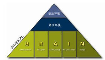 要達(dá)到清晰易懂的談話效果需要五個(gè)要素的配合:帶寬(Bandwidth)、回響(Reverberation)、振幅(Amplitude)、交互性(Interaction)、噪音水平(Noise)。任何一個(gè)會(huì)議系統(tǒng)的職責(zé)就是自動(dòng)調(diào)節(jié)和平衡這五個(gè)要素,使進(jìn)行交談的雙方都盡可能獲得最佳的聽覺享受。在英文里,我們可以用每個(gè)單詞的首字母來(lái)記憶這五個(gè)特征,即:BRAIN模型。