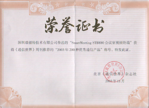 瑞福特視頻會(huì)議產(chǎn)品榮獲"2003年200種優(yōu)秀通信產(chǎn)品"稱號(hào)