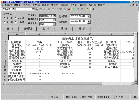 指定坐席的工作狀態(tài)(坐席工號(hào)、分機(jī)號(hào)碼、業(yè)務(wù)類型、忙閑狀態(tài)、通話時(shí)長(zhǎng)等)