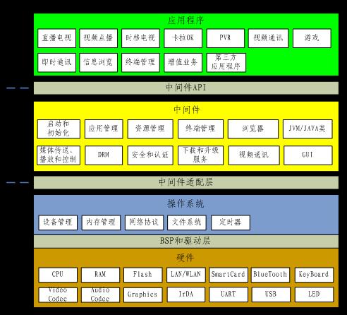 第三個中間件的可移植性可擴(kuò)展性。芯片廠家或第三方廠家提供的解決方案主要包括:硬件解決方案;實(shí)時(shí)操作系統(tǒng)層,包括了設(shè)備/網(wǎng)絡(luò)驅(qū)動、文件系統(tǒng)、圖形/字體驅(qū)動、網(wǎng)絡(luò)協(xié)議;瀏覽器模塊,其他模塊需要機(jī)頂盒制造廠家進(jìn)行研發(fā),而這些正是競爭差異和難度所在。產(chǎn)業(yè)要做大,就需要更多的廠家進(jìn)入。理想的中間件客戶端基于操作系統(tǒng)層和硬件;使得更多的缺乏固網(wǎng)技術(shù)經(jīng)驗(yàn)的廠家能夠加入到機(jī)頂盒產(chǎn)業(yè)鏈中,專注于機(jī)頂盒基礎(chǔ)研發(fā)和生產(chǎn),使得中間件移植的難度最小、時(shí)間最短