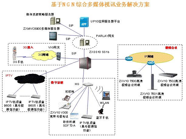 該方案以軟交換SS或IMS(IP多媒體子系統(tǒng))為核心交換網(wǎng)、以SIP協(xié)議作為其核心通信協(xié)議同時兼容H.323,采用業(yè)務(wù)與網(wǎng)絡(luò)、信令與媒體相分離的先進設(shè)計思想,能夠充分融合專業(yè)視訊終端、PC軟終端、固網(wǎng)語音終端,乃至3G終端(包含CS、PS域)等多樣化的類型終端,從而提供內(nèi)容豐富、和無所不在的多媒體業(yè)務(wù)應(yīng)用。